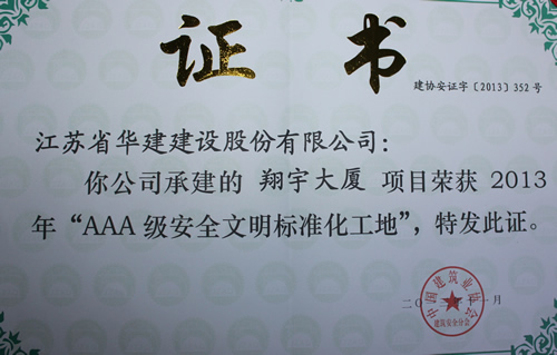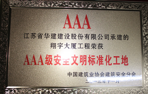 公司首獲全國“AAA級安全文明標準化工地” 時間:2013-12-12 5061 日前,由上海區域公司蘇北分公司承建的淮安翔宇大廈被中國建筑業協會評為2013年全國“AAA級安全文明標準化工地”,這是國內安全文明施工最高獎項,旨在規范建筑施工安全生產,保障建筑職工安全與健康,提高施工現場安全管理水平。這是上海區域公司第一次獲此殊榮,也是江蘇華建第8項全國3A級安全文明標準化工地,該工程還被評為2012年度江蘇省建筑施工文明工地、2013年度江蘇省建筑業新技術應用示范工程。