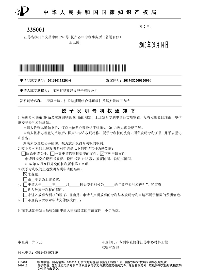 公司獲一項發明專利 時間:2015-09-15 5613 日前,江蘇華建上海區域公司發布的《混凝土墻、柱拉結筋用組合體預埋件及其安裝施工方法》發明創造被國家知識產權局授予“發明專利權”,專利號:201310153200.6。