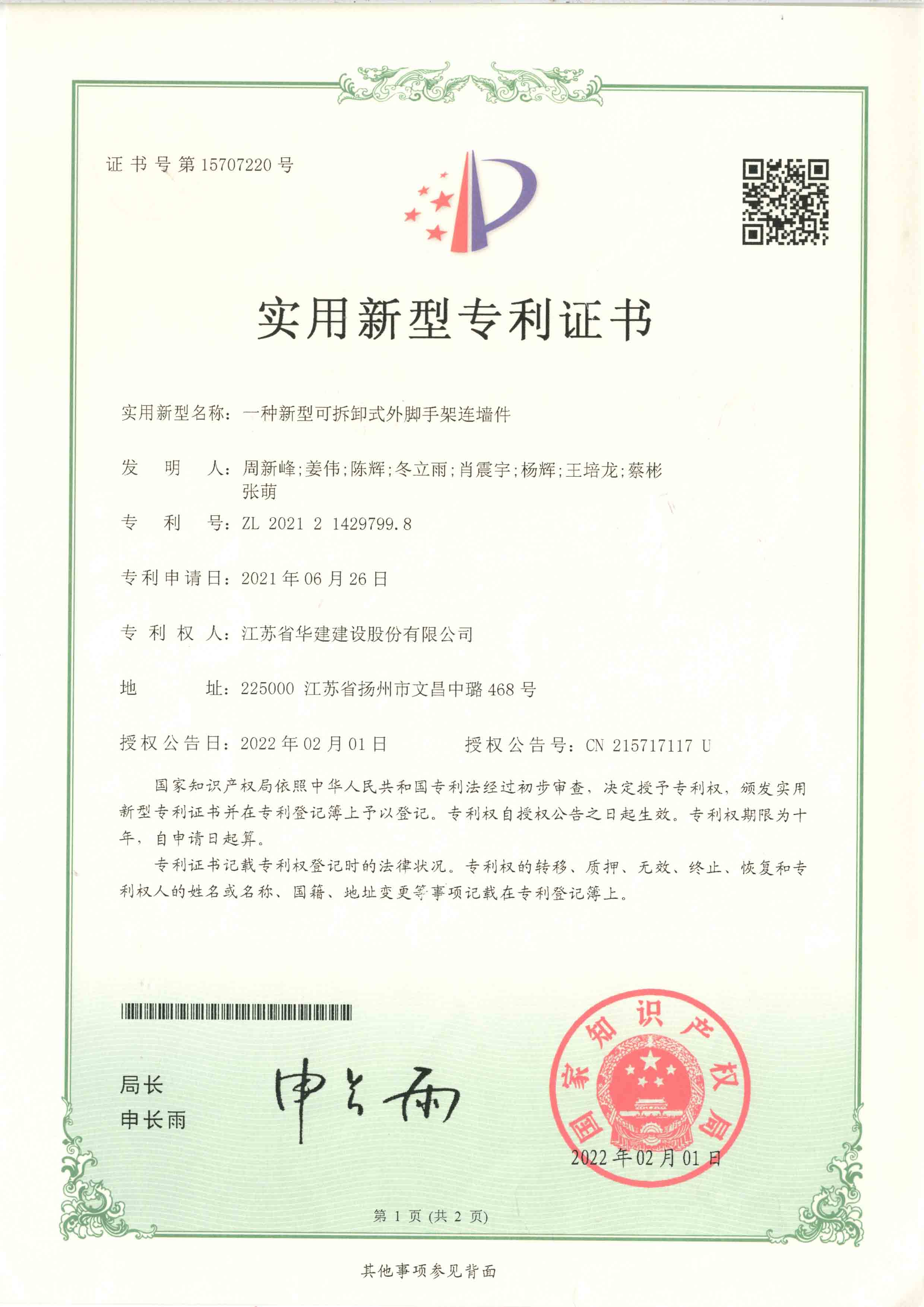 北京分公司2022年度已取得兩項實用新型專利證書 時間:2022-08-22 3718 日前,國家知識產權局頒發了實用新型專利證書,公司兩項專利取得實用新型專利證書,分別是:一種新型可拆卸式外腳手架連墻件、一種鋼筋混凝土現澆板板厚高精度控制裝置。