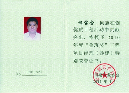 施寶金 時間:2012-04-10 7437 施寶金,高級工程師,現任深圳公司七處二工區常務副主任、項目經理。1996年到深圳參加工作,參與過國際商會中心、榮超經貿中心、江勝大廈、綠景紀元大廈等重點項目施工,獲“深圳市建筑業企業優秀項目經理”稱號,被授予“創魯班獎工程項目經理特別榮譽證書”。