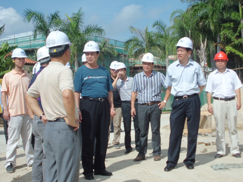 海南省委書記羅保銘等視察海南公司 時間:2012-06-07 4450 6月6日下午,海南省委書記羅保銘,省委常委、副省長、三亞市委書記姜斯憲冒著高溫來到我公司承建的鹿回頭國賓館二期擴建項目現場視察慰問,公司副總經理、海南分公司總經理王宏陪同視察。羅書記對華建的施工進度和質量表示滿意,同時要求華建把工程當做作品來抓,按時交付代表海南水平的精品項目。羅書記高度評價江蘇華建的綜合實力,認為華建在海南承建了許多重點項目,是一支有實力、善打硬仗的隊伍。姜斯憲副省長希望華建在海南繼續保持良好發展勢頭,為江蘇建筑業爭光。