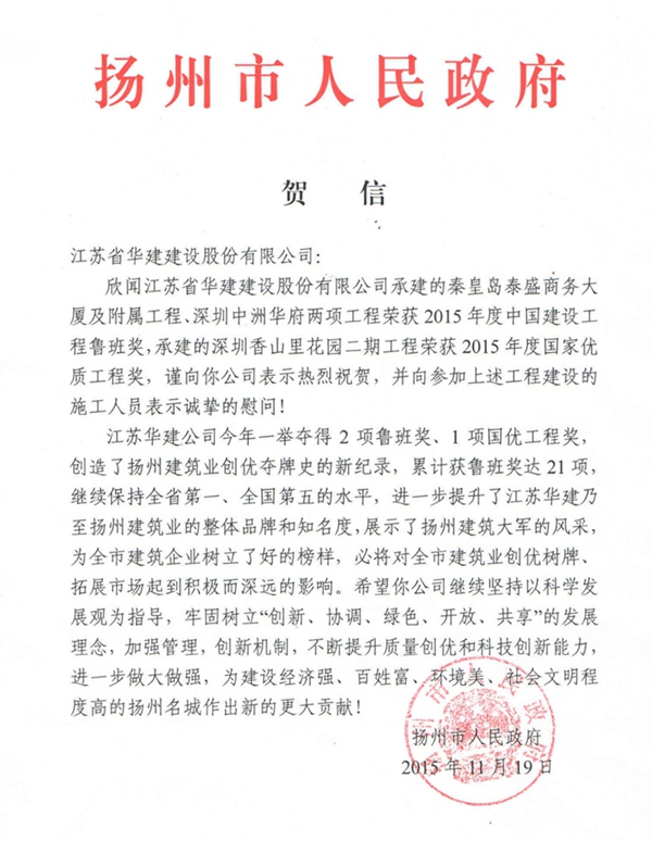 揚(yáng)州市政府向江蘇華建發(fā)來(lái)賀信 祝賀一年內(nèi)獲三項(xiàng)國(guó)家質(zhì)量大獎(jiǎng)