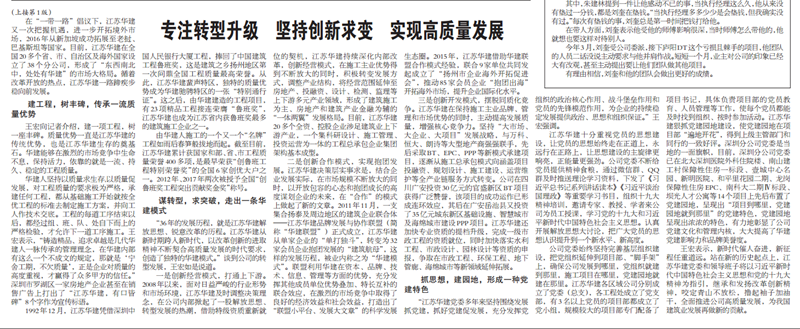 王宏董事長接受《建筑時報》專訪:專注轉(zhuǎn)型升級,堅持創(chuàng)新求變,實現(xiàn)高質(zhì)量發(fā)展 時間:2018-09-11 3863 9月10日,《建筑時報》頭版及微信公眾號對王宏董事長的專訪給予了刊載。 王宏董事長在專訪中就江蘇華建成立36年來,是如何在改革開放的時代大背景下,走出一條具有華建特色的高質(zhì)量發(fā)展之路,跨入新時代,江蘇華建又是如何以改革創(chuàng)新的進(jìn)取精神不斷轉(zhuǎn)型升級,契合高質(zhì)量發(fā)展的時代要求,創(chuàng)造出獨特的華建模式進(jìn)行了詳細(xì)介紹。