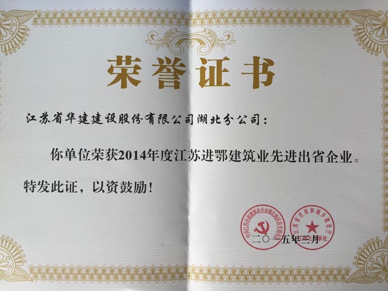 湖北分公司首獲2014年度江蘇省進(jìn)鄂建筑業(yè)先進(jìn)企業(yè)