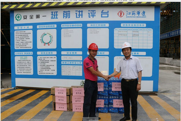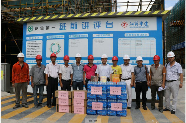 區(qū)域公司領(lǐng)導(dǎo)赴三亞工地進行高溫慰問 時間:2015-06-20 3211 6月19日上午,海南分公司黨總支副書記沈巨青帶隊,在分公司工會代表等相關(guān)部門陪同下,走訪慰問了三亞婦幼保健院項目部,看望了堅守崗位奮戰(zhàn)在高溫一線的項目部人員,并給他們送去了礦泉水、洗漱用品和防暑藥品。 慰問組一行實地了解項目部的進展情況以及現(xiàn)場人員的食、住、行、業(yè)務(wù)學(xué)習安排等情況,叮囑大家在高溫季節(jié)要切實加強現(xiàn)場管理,繃緊安全弦,確保平穩(wěn)有序生產(chǎn)。