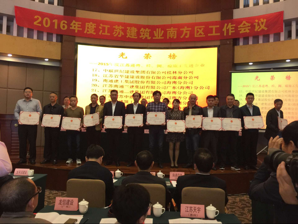 3月24日上午,江蘇省人民政府駐深圳(廣州)辦事處和江蘇省住房和城鄉(xiāng)建設(shè)廳在廣西南寧召開2015年度江蘇進(jìn)粵、桂、閩、瓊施工工作會(huì)議,公司副總、海南公司總經(jīng)理王宏出席會(huì)議。會(huì)上,海南分公司被表彰為“2015年度江蘇進(jìn)粵、桂、閩、瓊施工先進(jìn)企業(yè)”,海南分公司副總、總工程師高家馴被表彰為優(yōu)秀企業(yè)經(jīng)理。