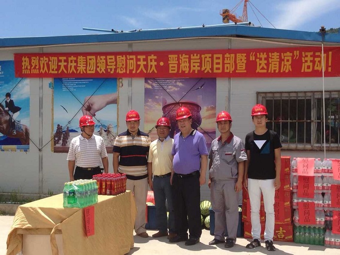 千里送清涼——天慶集團(tuán)董事長(zhǎng)韓慶慰問(wèn)我司一線職工 時(shí)間:2015-08-05 4133 8月4日中午,烈日當(dāng)空,驕陽(yáng)似火。甘肅天慶房地產(chǎn)集團(tuán)有限公司董事長(zhǎng)韓慶一行不遠(yuǎn)千里來(lái)到廣東珠海,頂著烈日,冒著酷暑,在項(xiàng)目負(fù)責(zé)人陳建的陪同下,慰問(wèn)我司承建的“天慶·晉海岸”項(xiàng)目一線施工人員,給工人們送來(lái)了西瓜、礦泉水、王老吉等飲品和深情問(wèn)候,讓廣大一線職工在炎炎烈日下感受到陣陣清涼。