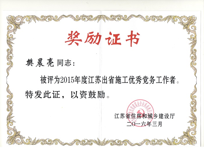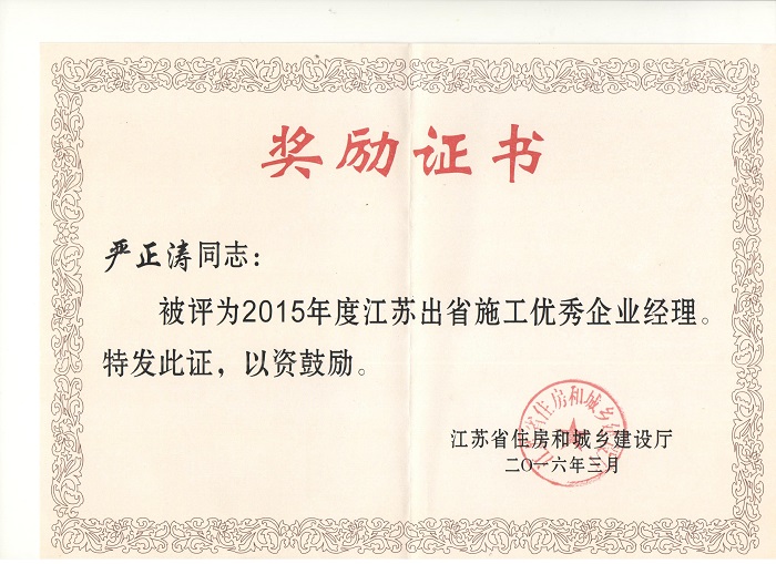 重慶分公司被表彰為“2015年度江蘇出省施工先進(jìn)企業(yè)” 時(shí)間:2016-04-20 2979 近日,重慶分公司被江蘇省住房和城鄉(xiāng)建設(shè)廳表彰為“2015年度江蘇出省施工先進(jìn)企業(yè)”,重慶分公司總經(jīng)理嚴(yán)正濤榮獲“2015年度江蘇出省施工優(yōu)秀企業(yè)經(jīng)理”稱號(hào),樊晨亮被評為“2015年度出省施工優(yōu)秀黨務(wù)工作者”。