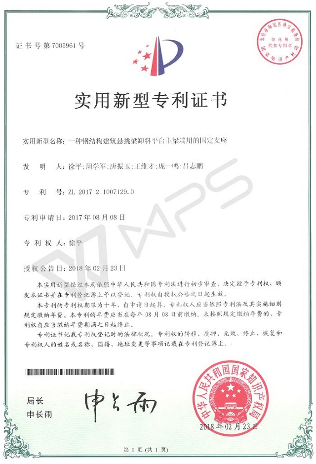 公司新獲一項國家實用新型專利授權 時間:2018-03-09 2833 近日,從國家知識產權局傳來喜訊,公司申請的《一種鋼結構建筑懸挑梁卸料平臺主梁端用的固定支座》獲得實用新新型專利授權。 該專利取材于公司標桿項目華策國際大廈,在建筑鋼結構懸挑梁卸料平臺主梁端固定支座的安裝施工中,技術人員創造性地設計了一種結構簡單、便于拆裝且無需對建筑進行安裝預處理的固定支座。該支座能夠配合現有的較為先進的建筑方式,大幅提高施工效率,并降低安裝、拆卸過程中的安全風險。