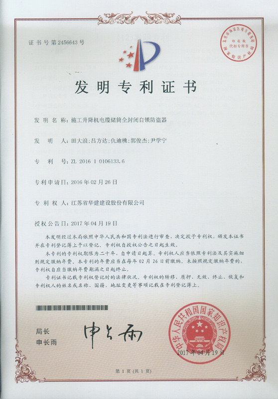 日前,公司又一項發(fā)明專利獲得國家知識產(chǎn)權(quán)局授權(quán),此項專利名稱為“施工升降機電纜儲筒全封閉自...