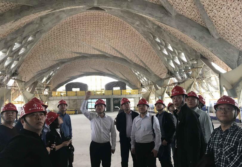 在瑪絲菲爾項目現場,雙方重點交流了藝術仿生建筑的超復雜結構施工技術和廢舊建筑垃圾轉化為裝飾材料的綠色施工技術。