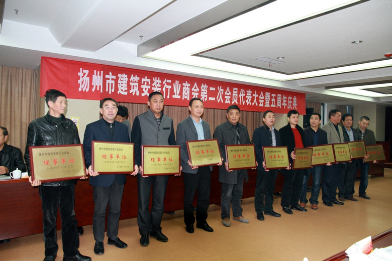陸金龍主持會員代表大會,第一屆理事會常務副會長吳士茂作了工作報告,吳士茂作為第二次會員代表大會籌備小組負責人還作了關于商會換屆選舉情況的說明。大會通過舉手表決的方式選舉產生了第二屆理事會和理事會領導機構。36名理事組成第二屆理事會,陸金龍連任當選第二屆理事會會長,吳士茂任常務副會長,曹德榮等9名同志任副會長。趙振東宣讀了市工商聯、總商會關于同意揚州市建筑安裝行業商會換屆選舉結果的批復。大會舉行了會長單位、副會長單位和理事單位授牌儀式。任壽松代表兄弟友好商會、張紹華代表市民政局分別致賀辭。