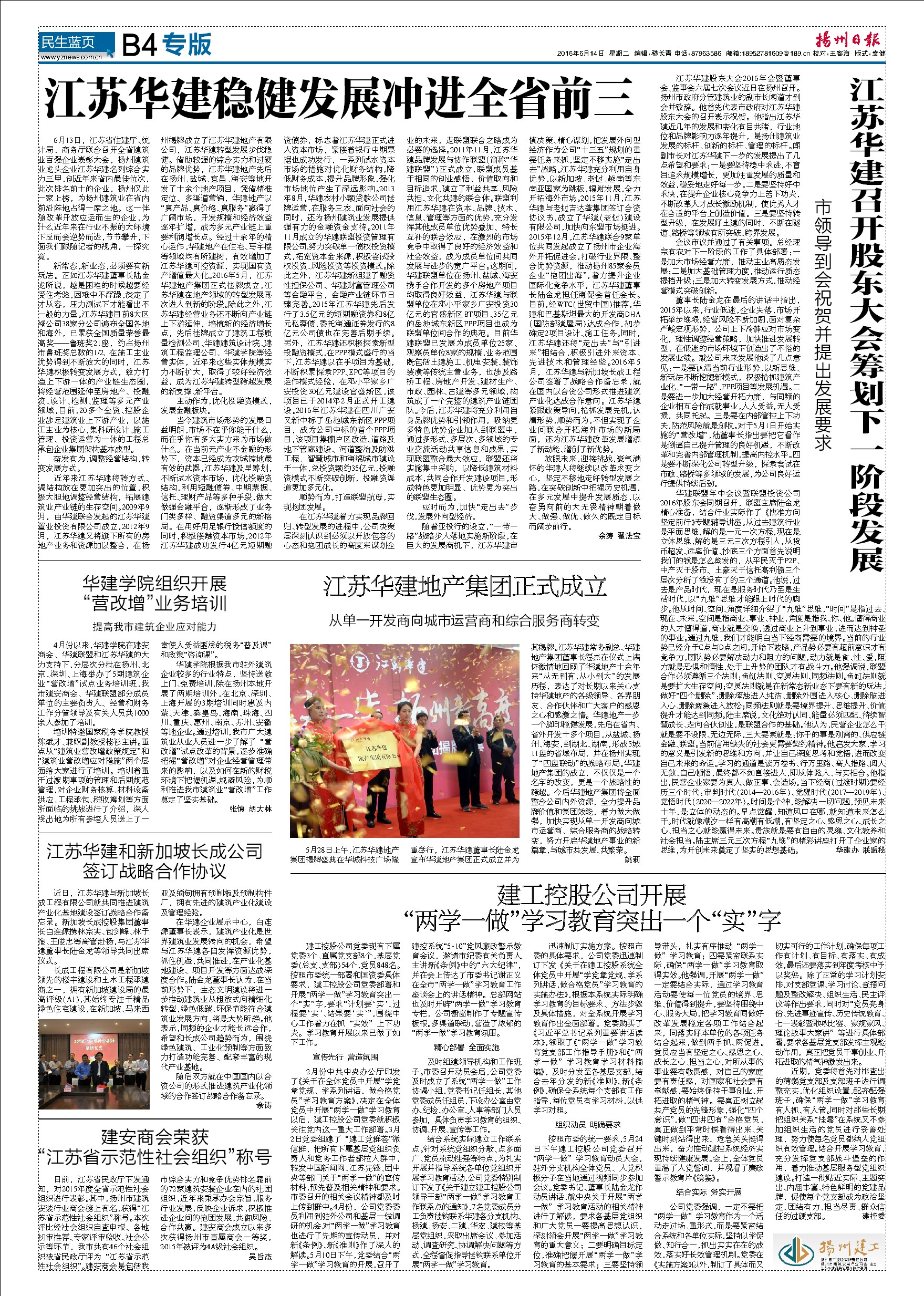 今日《揚州日報》刊登專版文章報道華建進入全省前三有關消息 時間:2016-06-14 4283 今天出版的《揚州日報》B4“揚州建工”專版刊登了江蘇華建穩健發展沖進全省前三、華建股東大會、華建地產集團成立、“兩學一做”學習教育等相關文章,歡迎關注。